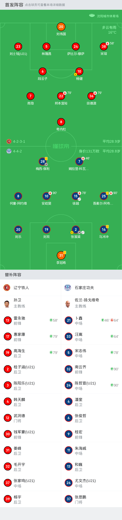 上场替补:79分钟17-惠家康, 58分钟13-雷永驰, 79分钟19-高海生