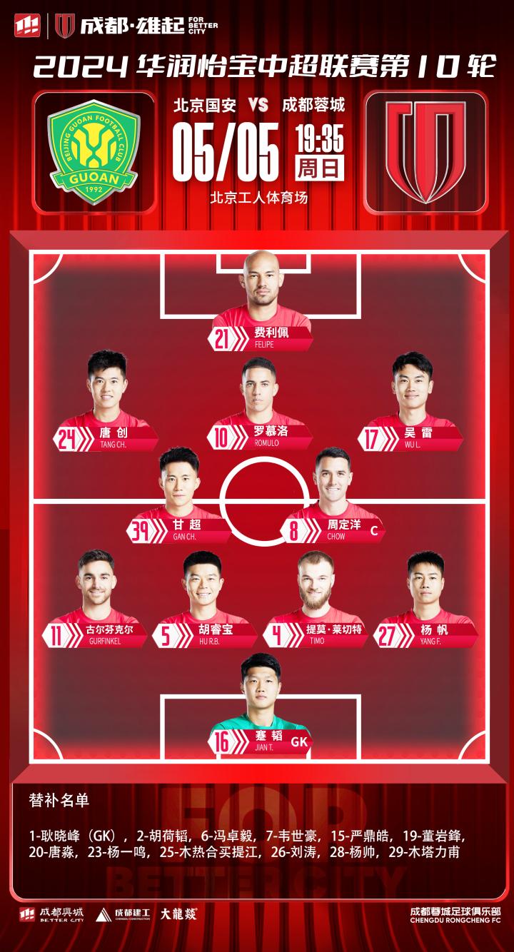 北京国安vs成都蓉城 比赛首发名单出炉! 成都,雄起!
