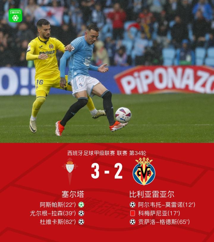 在西班牙足球甲级联赛第34轮比赛中,塞尔塔队在主场迎战比利亚雷亚尔队。上半场,阿尔韦托-莫雷诺抽射破门,科梅萨尼亚飞铲染红,阿斯帕斯点射扳平,尤尔根-拉森反超比分。下半场,贡萨洛-格德斯抽射破门,杜维卡斯替补建功,最终,塞尔塔3-2比利亚雷亚尔。