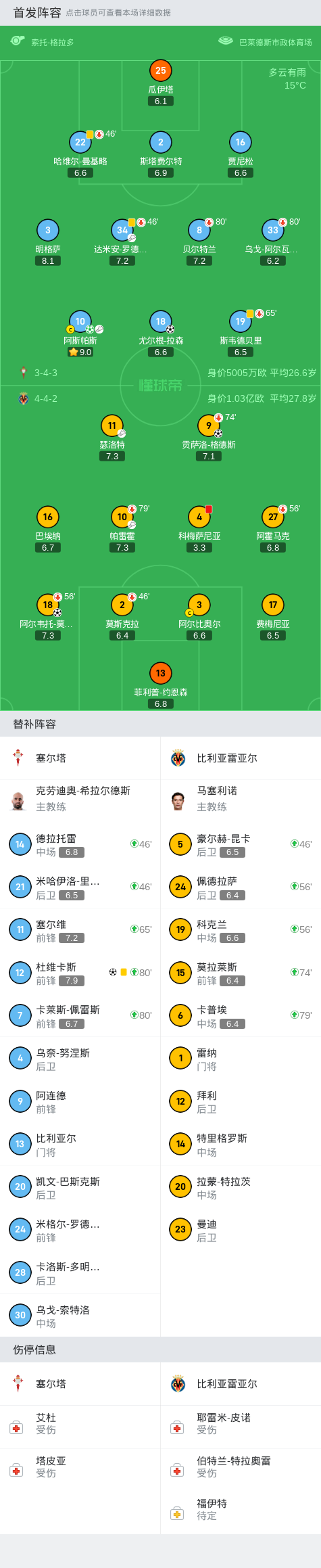 比利亚雷亚尔首发:3-阿尔比奥尔, 10-帕雷霍, 17-费梅尼亚, 18-阿尔韦托-莫雷诺, 11-瑟洛特, 9-贡萨洛-格德斯, 4-科梅萨尼亚, 16-巴埃纳, 13-菲利普-约恩森, 2-莫斯克拉, 27-阿霍马克