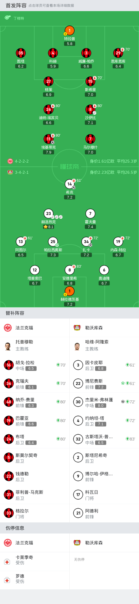 法兰克福首发:1-特拉普, 27-格策, 15-斯希里, 4-科赫, 7-马尔穆什, 26-迪纳-埃宾贝, 29-恩库恩库, 35-图塔, 3-威廉-帕乔, 11-埃基蒂克, 8-沙伊比