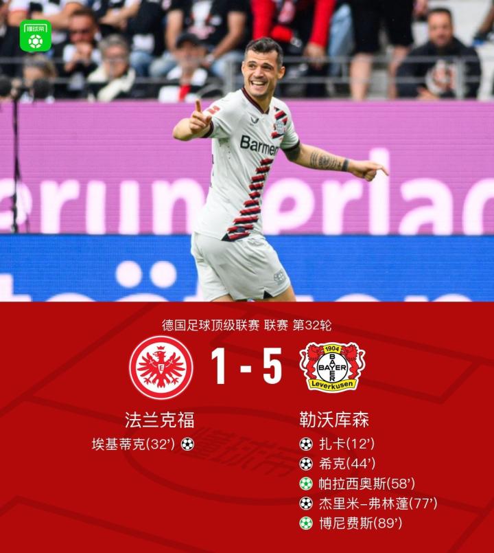 勒沃库森5-1客胜法兰克福,扎卡世界波,赫洛热克助攻戴帽