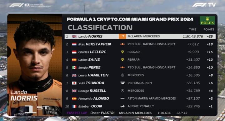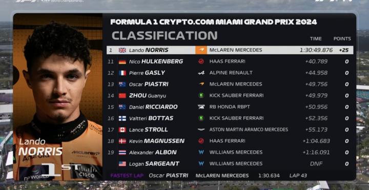 F1迈阿密大奖赛:诺里斯生涯首冠,维斯塔潘第二,周冠宇14