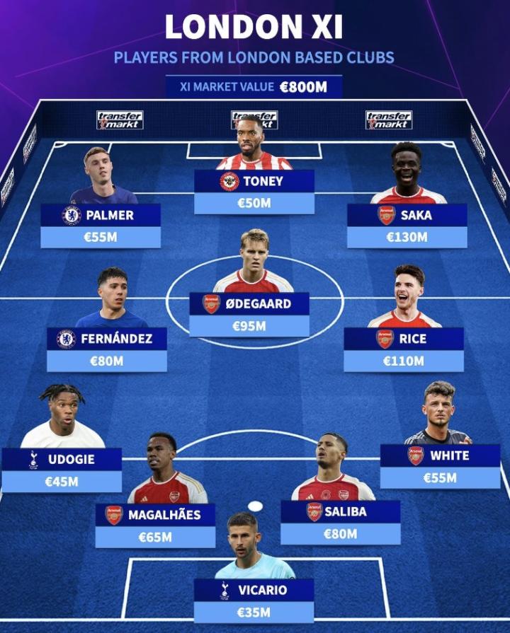 德转列伦敦球队最佳阵容:萨卡领衔枪手6人入选,帕尔默在列