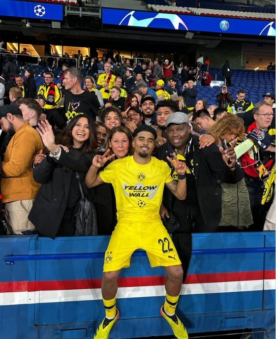欧冠半决赛次回合交锋,多特蒙德客场1-0击败巴黎圣日耳曼,以两回合总比分2-0挺进决赛。赛后,多特蒙德边卫马特森在场边与家人们合影留念,一起享受着晋级的开心时刻。
