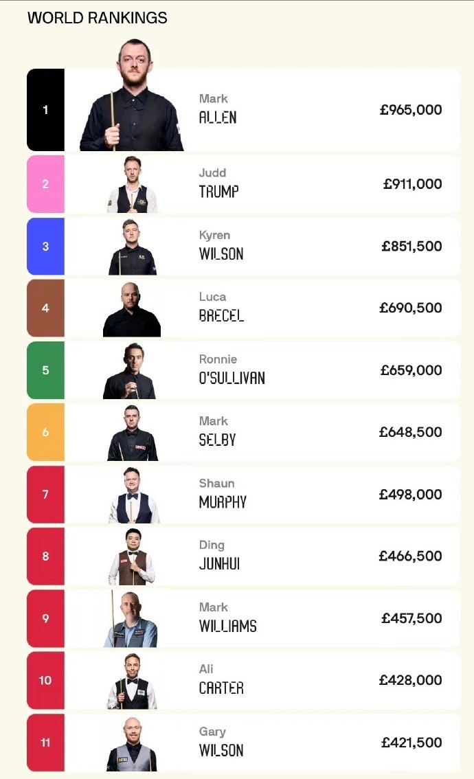 刚刚收获世锦赛冠军的凯伦-威尔逊跃升至第3位,仅次于艾伦与特鲁姆普,第3位是威尔逊职业生涯迄今为止最高排名。