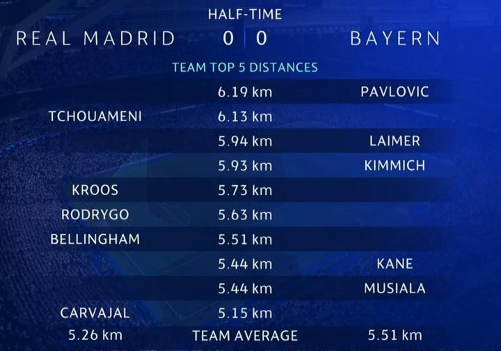 在上半场比赛中跑动距离最多的是拜仁中场亚历山大-帕夫洛维奇,第二多的则是皇马中场楚阿梅尼,莱默尔和基米希排在第三、四位。