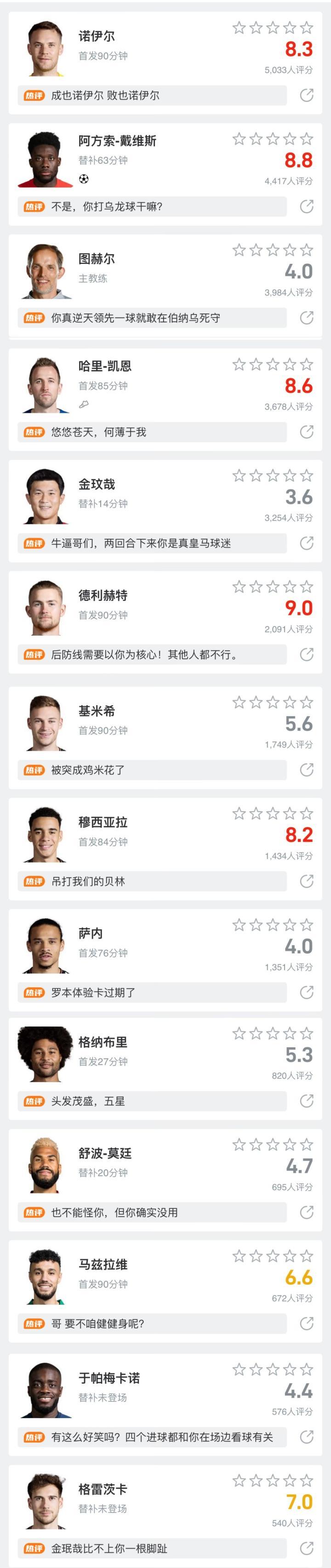 拜仁vs皇马赛后球迷评分:金玟哉3.6分最低,安帅9.5分最高