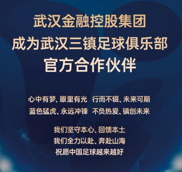 武汉金融控股集团发文表示,集团认真贯彻落实中央金融工作会议精神,按照市委专题会“专注主业、立足本地、回归本源”的工作部署,坚持立足武汉、赋能武汉,支持本土产业发展。将与武汉三镇足球俱乐部建立紧密、共赢的合作伙伴关系,为湖北武汉足球奉献力量。