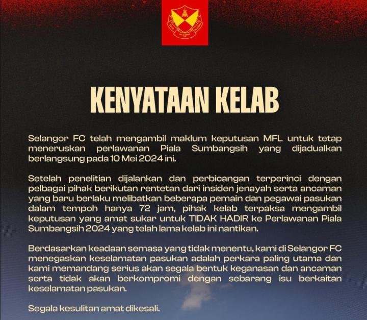 马来西亚联赛俱乐部雪州宣布,由于在过去的一周内发生3起针对马来西亚球员的袭击案件,为了保护球员的人身安全,决定不参加原定于5月10日举行的对阵柔佛新山的联赛揭幕战。