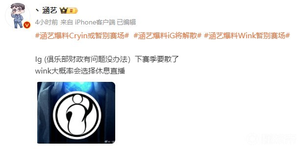 今天下午,LPL知名经纪人、前V5教练、爆料第一人的涵艺在其社交平台发文称,因俱乐部财政有问题没办法,iG电子竞技俱乐部下赛季即将解散。