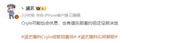 而同样分属于iG《英雄联盟》分部的Cryin选手可能也会休息,也有俱乐部邀约但还没做决定。