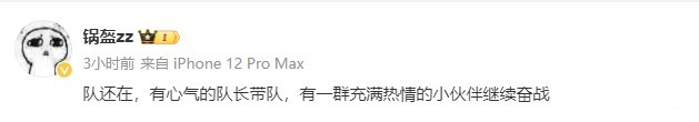 在涵艺发文后1小时,iG俱乐部经理锅盔也通过其个人社交平台发文,似乎是对涵艺的爆料进行隔空回应,他提到:“队还在,有心气的队长带队,有一群充满热情的小伙伴继续奋战。”