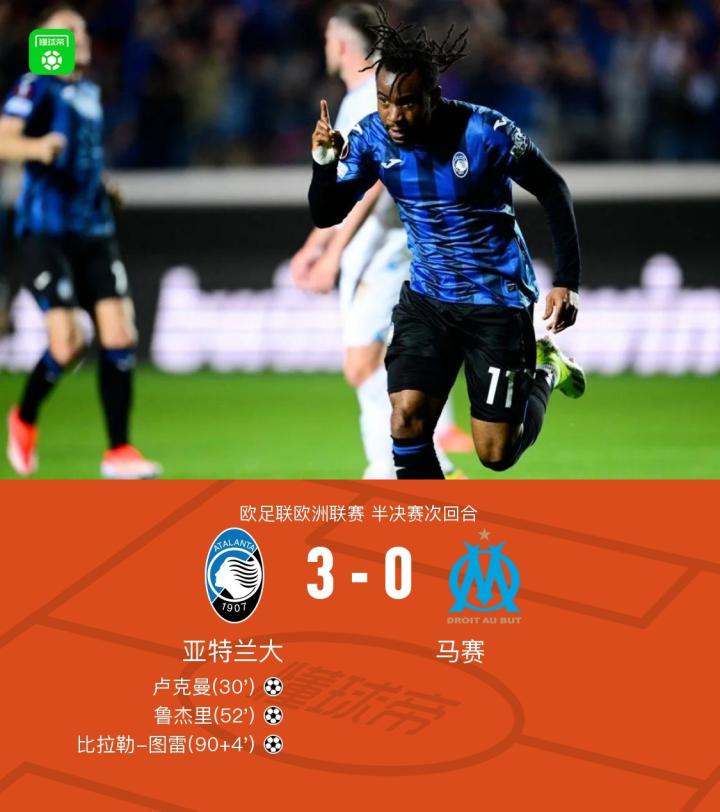 北京时间5月10日欧足联欧洲联赛 半决赛次回合,亚特兰大主场对阵马赛。上半场德凯特拉雷小角度中柱,随后斯卡马卡禁区打门击中横梁,卢克曼低射破门,下半场鲁杰里爆射死角扩大扩大比分,库普梅纳斯打门被扑,图雷锁定胜局。最终比分亚特兰大 3-0 马赛。两回合总比分亚特兰大4-1马赛。