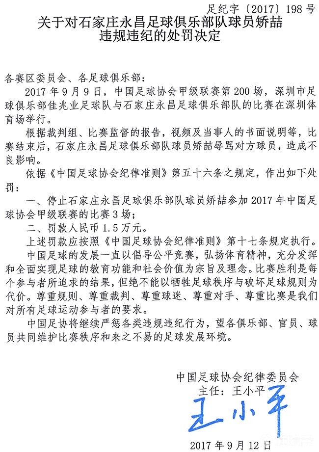 一、停止石家庄永昌足球俱乐部队球员矫喆参加2017年中国足球协会甲级联赛的比赛3场;
