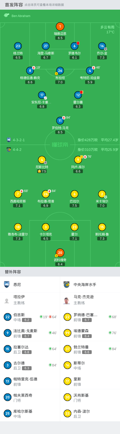 中央海岸水手2-1逆转悉尼取澳超6连胜,米卡埃尔点射破门,尼斯比特建功