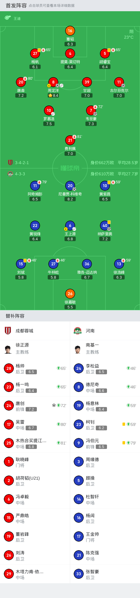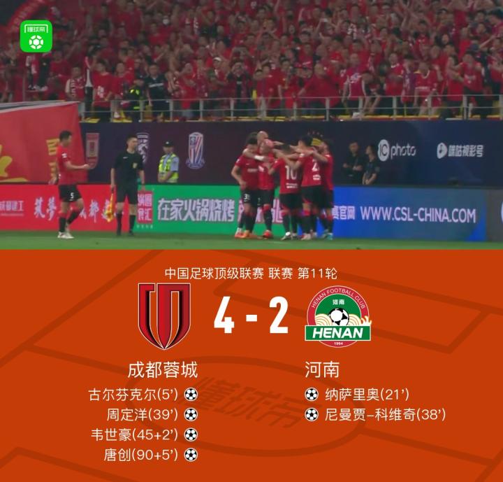 北京时间5月10日中国足球顶级联赛 联赛 第11轮,成都蓉城主场对阵河南。上半场周定洋传中,韦世豪中路一漏,古尔芬克尔破门,之后纳萨里奥任意球破门扳平比分,随后王上源开出角球,科维奇头球反超比分,1分钟后周定洋补射破门闪电扳平,补时阶段罗慕洛开出角球,韦世豪头球破门再度领先。下半场补时阶段唐创破门被吹,VAR介入后判定有效,全场结束,成都蓉城4-2战胜河南。