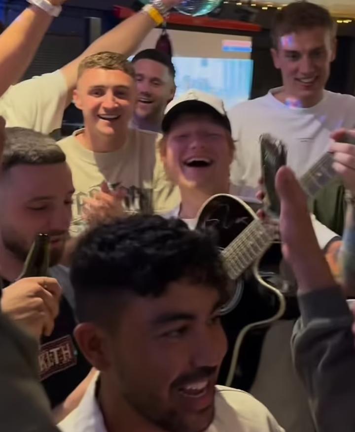 前锋康纳-查普林后来还唱了希兰的第一首热门单曲《A Team》,艾德-希兰则弹着吉他伴奏,球队加入两人一起合唱,气氛超级好。