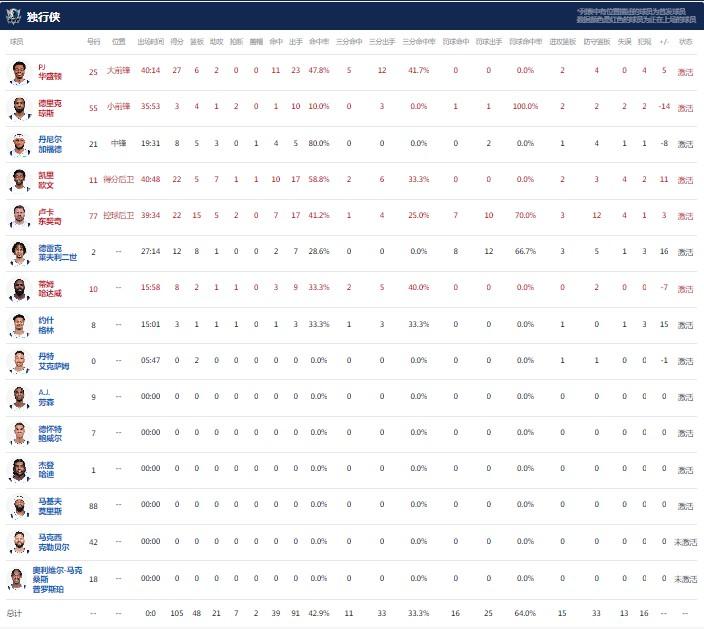 达拉斯独行侠PJ-华盛顿27分6板2助,东契奇22分15板5助2断,欧文22分5板7助1断1帽;