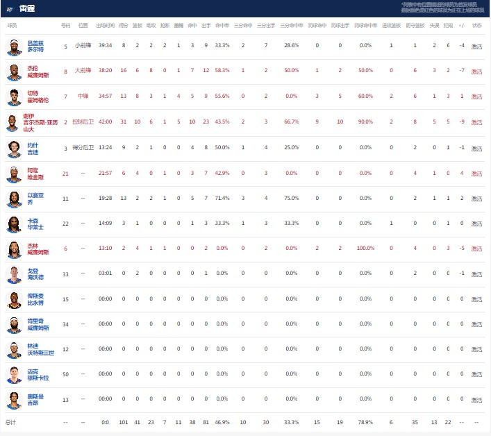 俄克拉荷马雷霆亚历山大31分9板6助2断4帽,杰伦-威廉姆斯16分5板8助1帽,以赛亚-乔13分1板2助1断。