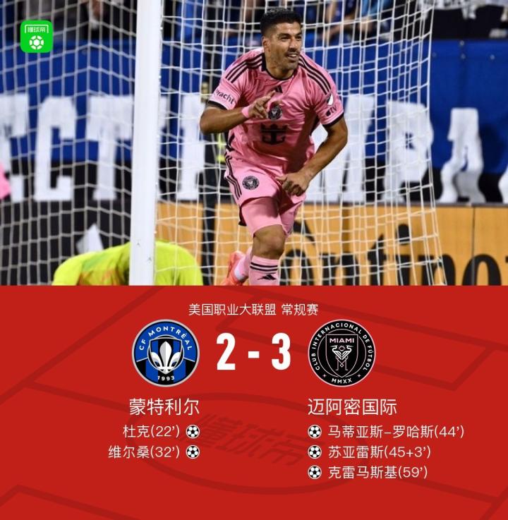 迈阿密国际3-2逆转蒙特利尔取美职联5连胜,苏亚雷斯破门