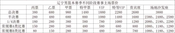 辽宁男篮总决赛主场门票最低380元,此前常规赛最低为80元
