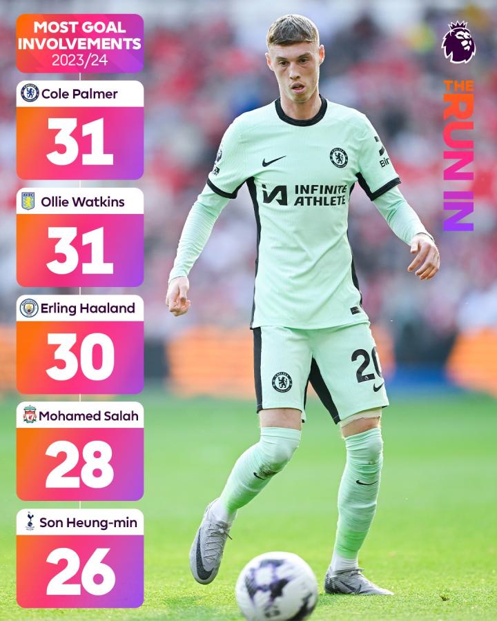 本赛季英超参与进球榜:帕尔默、沃特金斯31球并列第一