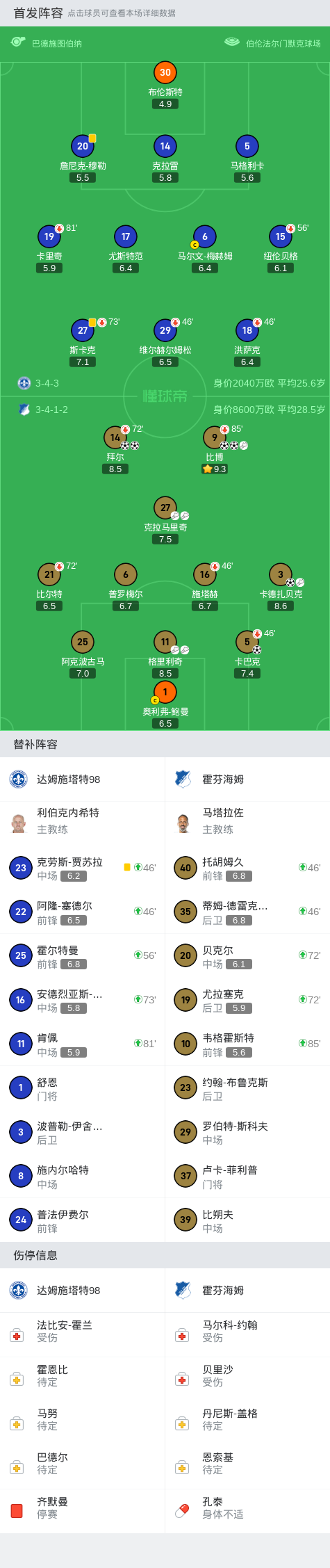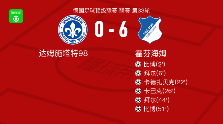 霍芬海姆6-0血洗达姆施塔特98,比博梅开二度,拜尔梅开二度