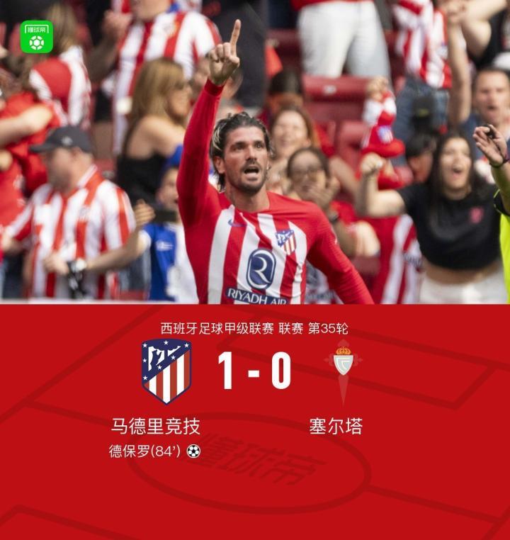 北京时间5月12日,西班牙足球甲级联赛第35轮,马德里竞技在主场迎战塞尔塔。上半场双方真正有威胁的机会不多,科克精准长传,略伦特打门错失良机,塞尔塔右路长传,维特塞尔关键解围力保城池;下半场奥布拉克神勇扑出阿斯帕斯的射门,巴勃罗-巴里奥斯小角度凌空射门同样被瓜伊塔神扑化解,德保罗凌空世界波打进全场唯一进球。最终,马德里竞技1-0战胜塞尔塔,获得西甲3连胜。