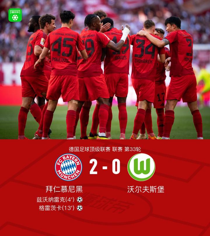 在德国足球顶级联赛第33轮比赛中,拜仁慕尼黑主场迎战沃尔夫斯堡。阿方索-戴维斯送出助攻,小将兹沃纳雷克闪电破门斩获处子球,之后格雷茨卡接穆勒传球推杆破门扩大比分。下半场拜仁小将延森、温勒夫完成一线队首秀,佩雷茨完成德甲首秀。最终拜仁联赛主场收官战2-0战胜沃尔夫斯堡。