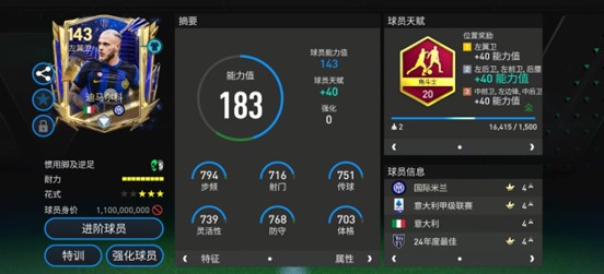 游戏中,迪马尔科在此前的年度最佳荣誉球员系列中推出了一张基础能力值143的球员卡。司职左翼位的他天赋配备角斗士,提升了加速、传中、人盯人、铲断、拦截五项数据。高级油炸丸子结合三星花式星级的花式配置保障了他的边路推进能力。