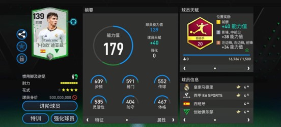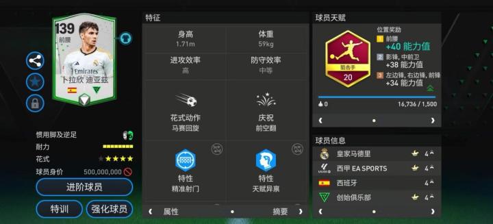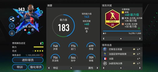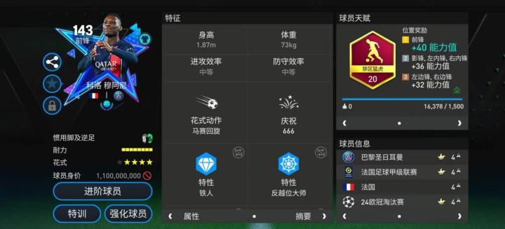 游戏中,穆阿尼在欧冠淘汰赛活动中推出的欧洲之星版本表现强势,基础能力值143的他配备了禁区猛虎天赋,射门、射门力量、抢点、盘带、力量五项数据进一步提升。花式配置上,马赛回旋搭配四星花式星级让他具备了稳定的推进能力。
