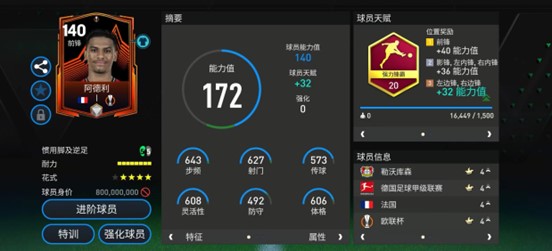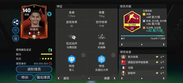 游戏中,阿德里在此前的欧联杯系列推出了一张基础能力值140的球员卡。司职前锋的他配备了强力锋霸天赋,对他的加速、射门、抢点、头球、力量五项数据都有提升。花式配置上,马赛回旋搭配四星花式星级让阿德利的过人更加高效。
