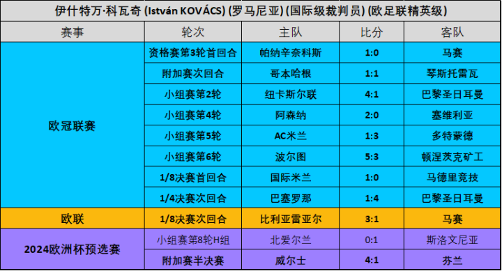 (图)23/24赛季科瓦奇欧战执法场次明细