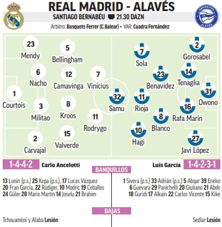 与上轮客战格拉纳达的大轮换相比,此次面对阿拉维斯安切洛蒂被认为会继续安排库尔图瓦首发,纳乔与米利唐搭档中后卫,卡瓦哈尔、费德里科-巴尔韦德、托尼-克罗斯、贝林厄姆、罗德里戈以及维尼修斯也都被认为会重返首发。