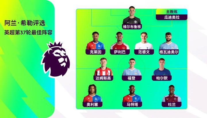 希勒评英超第37轮最佳阵:福登、帕尔默、格瓦迪奥尔在列