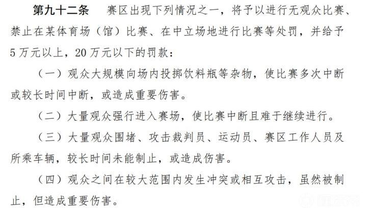 中国足协每个赛季都会向各赛区、各俱乐部印发《中国足协纪律准则》,2024版的第九十二条也清楚写明了相关规定。“观众大规模向场内投掷饮料瓶等杂物,使比赛多次中断或较长时间中断,或造成重要伤害”显然符合青岛海牛本次出现的情况。所以,除了将球场名字写错外,中国足协本次的处罚可以称得上是合规合理且与足球发达地区接轨。