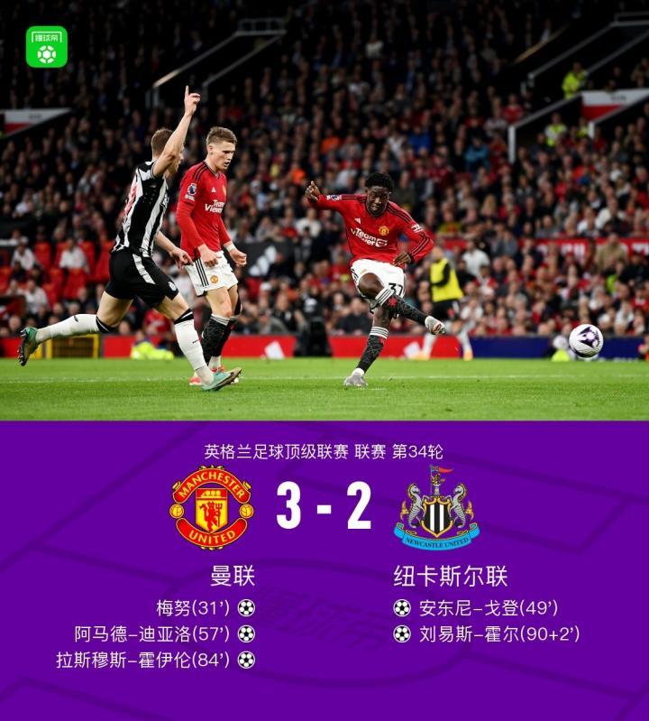 在英格兰足球顶级联赛第34轮比赛中,曼联主场迎战纽卡斯尔联。上半场迪亚洛远射被扑,梅努禁区低射破门,卡塞米罗门线救险,吉马良斯头球造险,下半场戈登铲射扳平比分,迪亚洛爆射得分,奥纳纳屡次救险,霍伊伦低射扩大比分,霍尔远射破门扳回一球。最终,曼联以3-2险胜纽卡斯尔联。