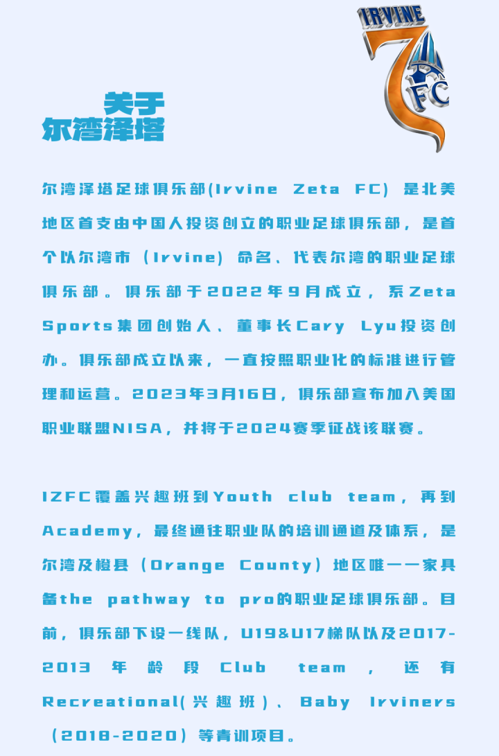 尔湾泽塔(Irvine Zeta FC)系一家位于美国加利福尼亚州尔湾市的职业足球俱乐部,成立于2022年9月,由Zeta Sports集团董事长Cary Lyu投资创办,也是全美首家由中国人投资且创办的职业足球俱乐部。2024赛季开始,Zeta FC征战美国第三级别职业联赛(National Independent Soccer Association)和美国公开杯(Lama Hunt U.S. Open Cup)。