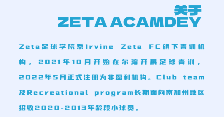 针对中国大陆地区,Irvine Zeta FC推出了多个合作项目,包括国际足球锦标赛(Zeta Kite Cup)、足球留学(College ID Camp)、青少年中短期赴美培训以及夏令营、冬令营等等。