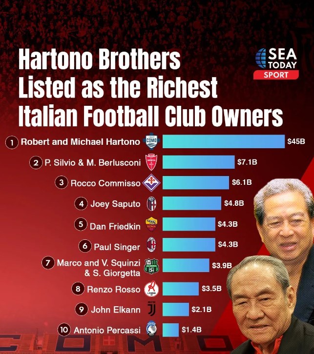 科莫的老板,是号称连续蝉联印尼首富称号近二十年的黄氏兄弟——黄惠忠和黄惠祥。没错,看名字也能看出来,两位大亨是祖籍福建的华裔。《福布斯》富豪榜显示,黄氏兄弟的资产分别为264亿美元(全球第71)和255亿美元(全球第76),两个人加一起,高达519亿美元的财富值,这个数值,能排在福布斯前30名,比戴尔、耐克两大巨头都要高。