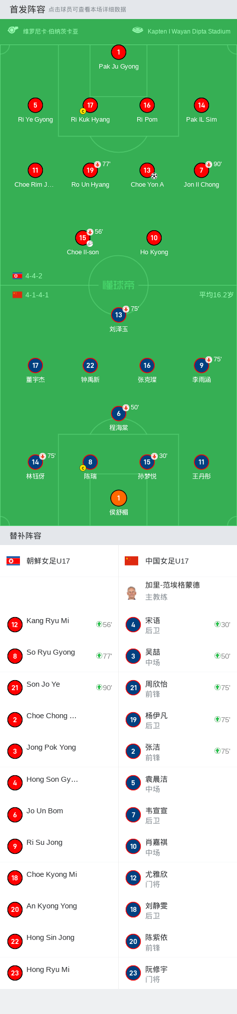 北京时间5月16日U17女足亚洲杯 半决赛,朝鲜女足U17主场对阵中国女足U17。比赛第10分钟,侯舒楣扑救失误,朝鲜女足Choe Yon A远射破门。最终比分朝鲜U17 1-0 中国女足U17晋级决赛,中国U17女足将在三四名决赛中迎战韩国女足。