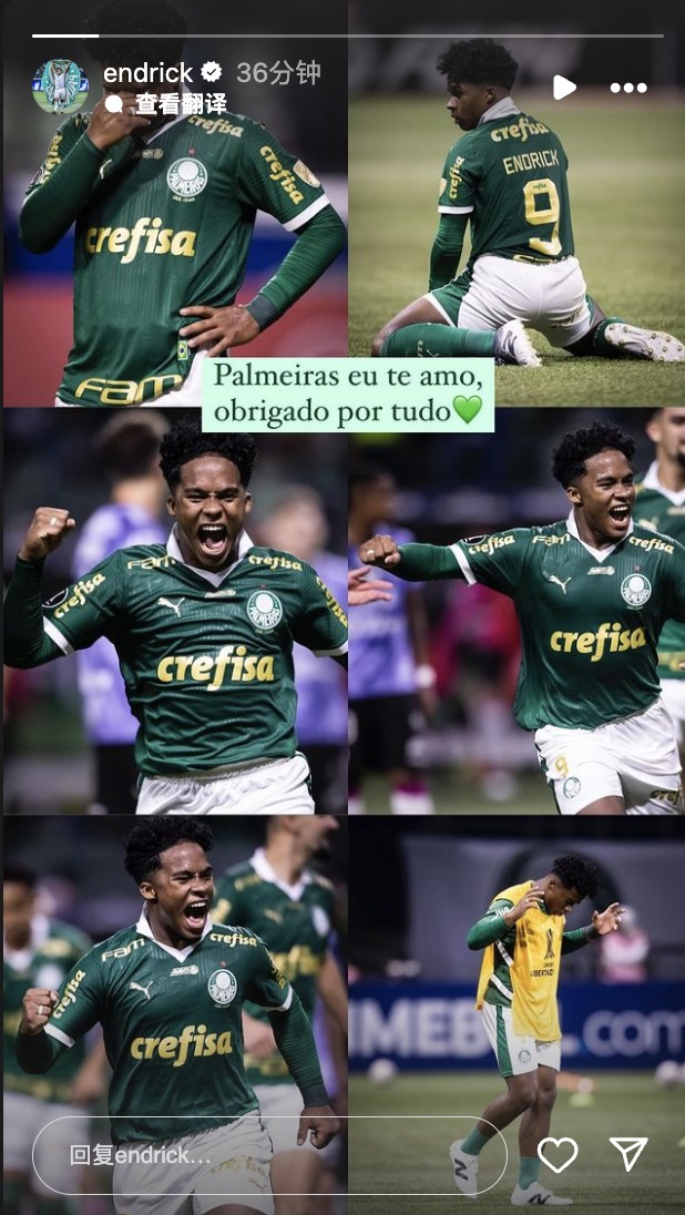 在对阵山谷独立的比赛后,恩德里克晒出了自己的照片,并配文道:“我爱你帕尔梅拉斯,感谢你所做的一切。”