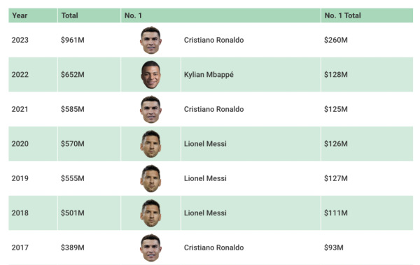 在德转2023年球员总收入排行榜上,C罗断层第一,姆巴佩位居第四,与排名第三的内马尔仅差2000万美元。