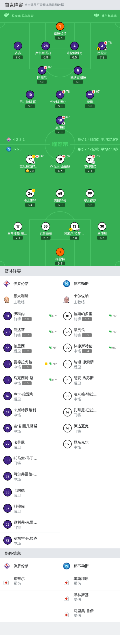 佛罗伦萨2-2那不勒斯,克瓦拉茨赫利亚、比拉吉对轰任意球