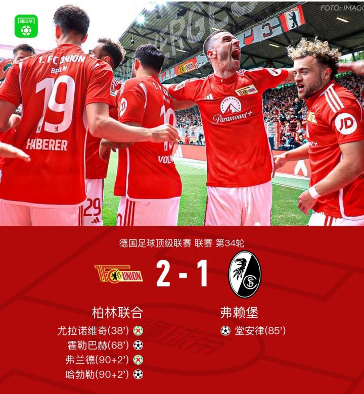 柏林联合2-1弗赖堡以净胜球优势惊险保级成功,哈勃勒绝杀