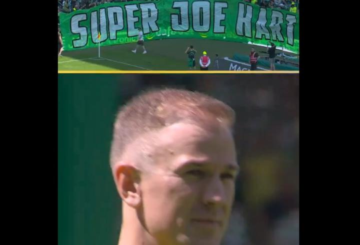在对阵圣米伦的主场告别战,看到球迷在看台为自己打出的巨幅Tifo,上面写着“超级乔-哈特(super Joe hart)”,乔-哈特神情十分动容。