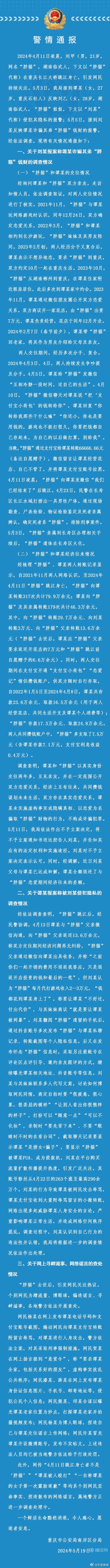 警方通报胖猫事件:谭某不构成诈骗犯罪,双方已达成和解柯MVP96 @懂球帝2024-05-19 20:4721岁王者荣耀代练“胖猫”因被网恋女友长期PUA、骗取自己辛苦赚的51万后被冷暴力、分手崩溃跳江自杀。之后,事件女主谭某报案称胖猫姐姐侵犯其隐私,胖猫姐姐称谭某诈骗胖猫钱财。今日,重庆市公安局南岸区分局发布了警情通报。相关阅读【为网恋女友花费51万后被分手,21岁王者代练“胖猫”跳江自杀】【胖猫事件女主:两年半共花35万,和男主爸爸签和解书后被反水】【“胖猫”姐姐:“胖猫”遗体已火化,会竭尽全力讨回公道】展开更多