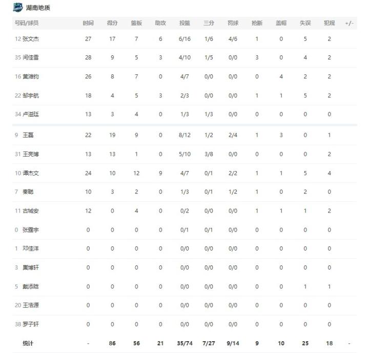 第二节,湖南依靠内线优势形成禁飞区,不断将比赛节奏牢牢控制。青岛六十七中外线手感冰冷,逐渐被拉开比分差距。半场战罢,湖南地质42-33青岛六十七中。