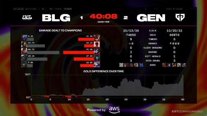 第33分钟,GEN找到机会击杀BLG中辅顺势拿下水龙魂。